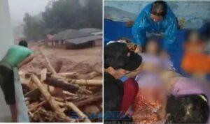Dalam sebuah video amatir yang beredar di Facebook, terlihat seorang pria berbaju hijau berdiri di lantai dua rumahnya sambil memandang banjir yang menghantam permukiman. Kayu besar bahkan sempat menerjang tembok rumah hingga nyaris mencapai tempat ia berdiri.