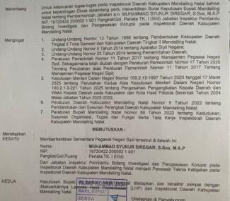 Dalam SK tersebut, bupati Madina memutasi Muhammad Syukur Siregar menjadi Penelaah Teknis Kebijakan pada Inspektorat Madina.