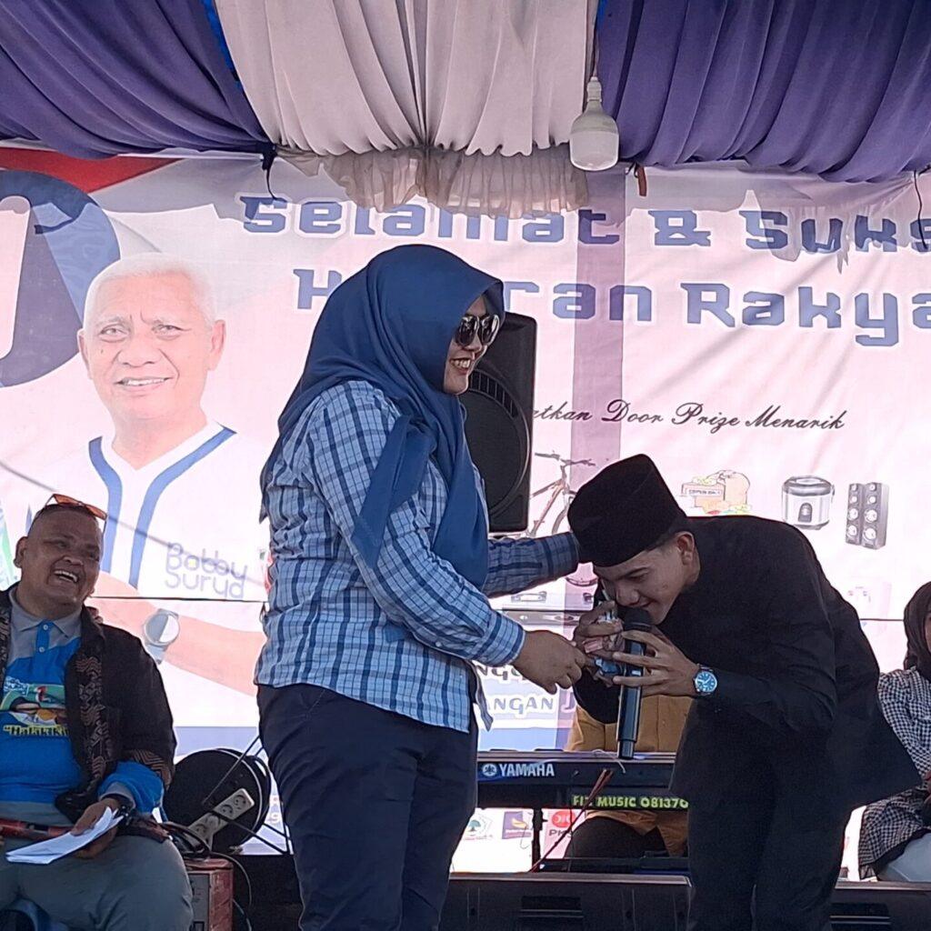Panyabungan,Madina – Calon wakil bupati Mandailing Natal (Madina) nomor urut 2, Atika Azmi Utammi Nasution, tak mampu menahan gairahnya untuk nyawer penyanyi bernuansa Islami saat menghadiri acara hiburan rakyat yang diprakarsai Tim Kampanye Daerah (TKD) Bobby-Surya di lapangan samping Kantor Bank Sumut, Kelurahan Panyabungan II, Kecamatan Panyabungan, Madina, Minggu (3/11).