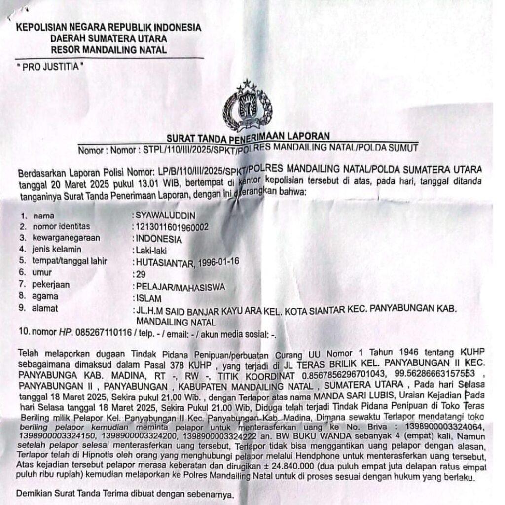 Mandailing Natal – Laporan Polisi (LP) Nomor B/110/III/2025/SPKT/Polres Mandailing Natal/Polda Sumatera Utara yang dilaporkan sejak 20 Maret 2025 dugaan kasus penipuan yang merugikan jasa transfer Teras Brilink diduga mengendap atau dibiarkan.
