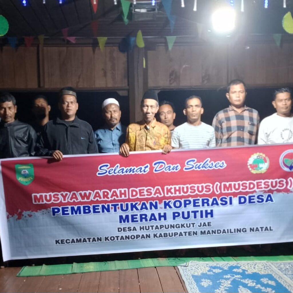 Kotanopan – Pemerintah Desa (Pemdes) Hutapungkut Jae, Kecamatan Kotanopan, Kabupaten Mandailing Natal (Madina), menggelar Musyawarah Desa Khusus (Musdesus) pada Minggu malam (11/5/2025) bertempat di Bagas Godang Hutapungkut Jae. Musyawarah ini digelar dalam rangka membentuk dan mengangkat pengurus serta dewan pengawas Koperasi Merah Putih Desa Hutapungkut Jae untuk masa bakti 2025–2030.