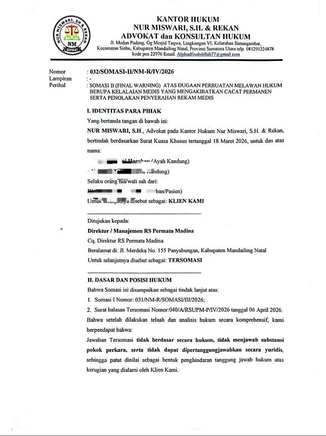 Nur Miswari dari Kantor Hukum Nur Miswari, SH & Rekan melayangkan somasi Terakhir karena menilai jawaban RS Permata Madina untuk somasi pertama tidak berdasar secara hukum, tidak menjawab substansi perkara, serta tidak dapat dipertanggungjawabkan secara yuridis.