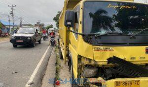 Dump truck tersebut dikemudikan oleh Guntur Nasution dan menabrak bagian depan sepeda motor yang dikendarai korban.