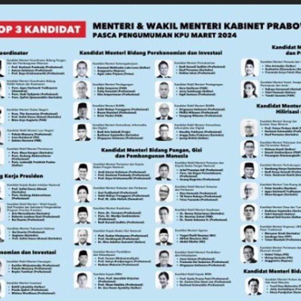 Meski bocoran ini belum dikonfirmasi, komposisi kabinet Prabowo-Gibran tersebut memberikan sinyal kuat akan arah kebijakan yang lebih tegas dan terukur. Dengan perpaduan antara militer, profesional, dan figur politik, kabinet ini diharapkan mampu menjawab tantangan besar yang dihadapi Indonesia di era mendatang.