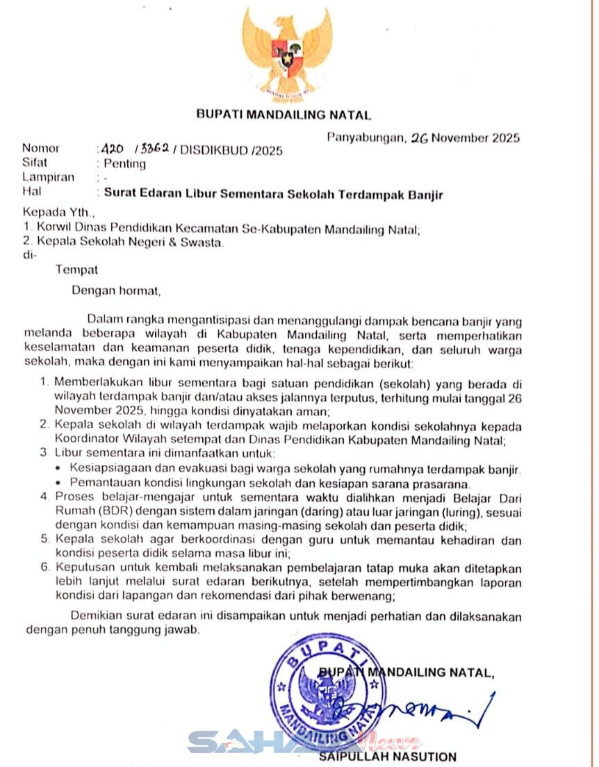 Cuaca Ekstrem Melanda, Pemkab Madina Tetapkan Libur Belajar Tatap Muka