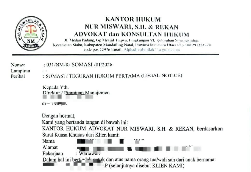 Hal itu berdasarkan salinan kedua somasi yang diterima media ini pada Senin, 30 Maret 2026. Salah satunya dilayangkan Kantor Hukum Nur Miswar, SH & Rekan sebagai kuasa yang ditunjuk keluarga RSH.